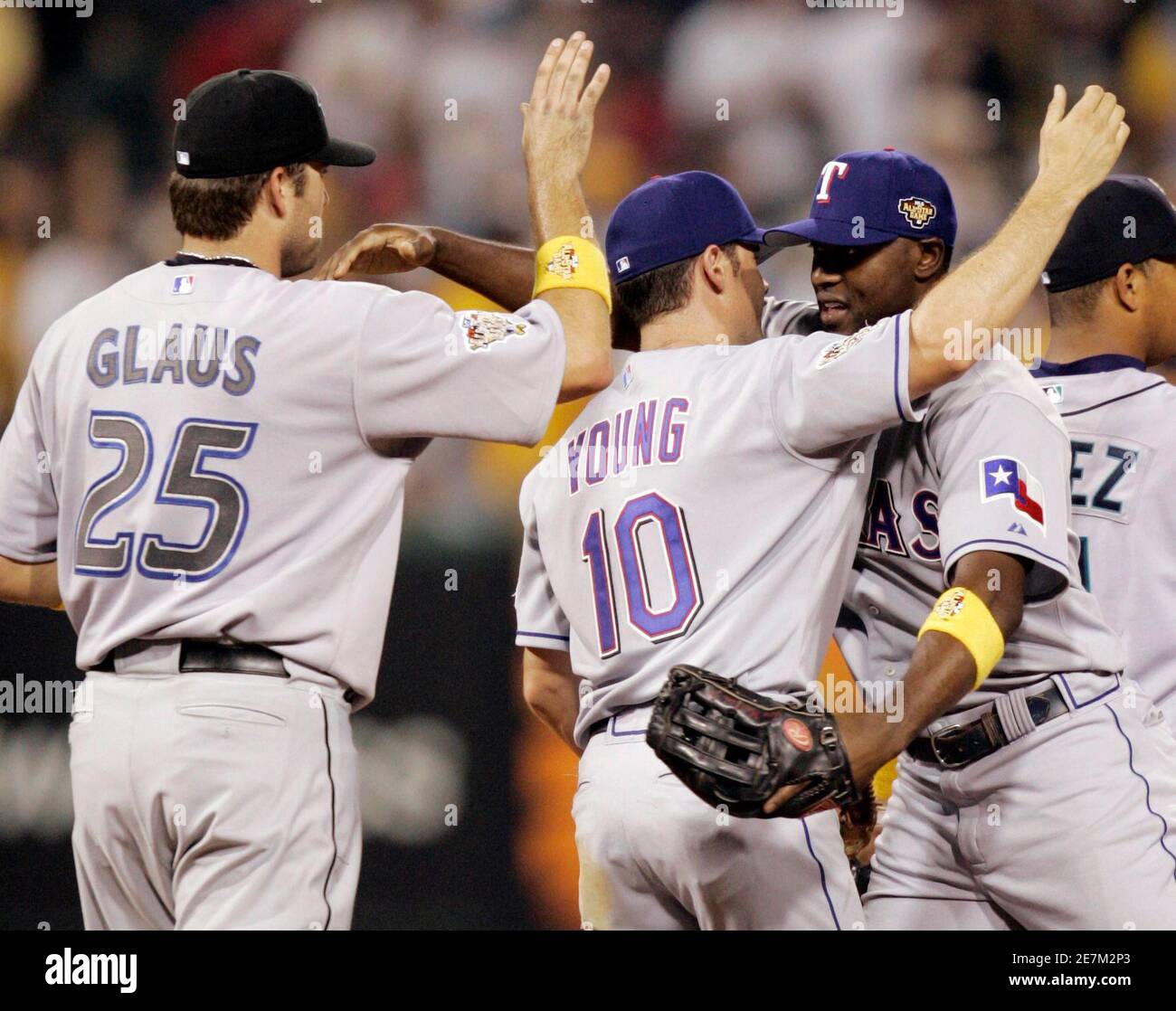 American League All Stars L R Troy Glaus Of The Toronto Blue Jays Michael Young And Gary Matthews Jr Of The Texas Rangers Celebrate Their Victory Over The National League At The 77th Annual